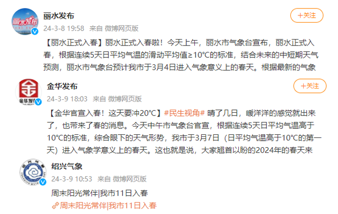 昨天浙江多地也已发布了入春消息:据微博@金华发布消息,金华市已于3月7日入春;@丽水发布消息,丽水市已于3月4日进入气象意义上的春天;@绍兴气象预判,绍兴市将于3月11日进入气象意义上的春天。