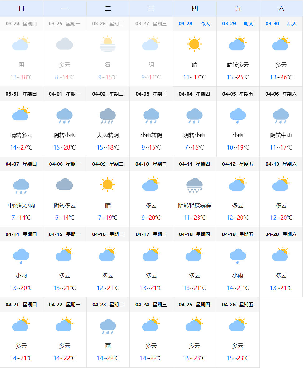 2024年3月29日:天气晴转多云,气温范围为13℃至26℃,西南风4~5级,空气质量良。