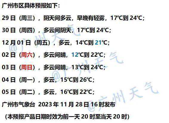 11月30日,西部市县多云间阴天有分散小雨,其余市县多云间晴。最低气温:粤北的北部市县10~13℃,南部沿海市县18~21℃,其余市县15~17℃。