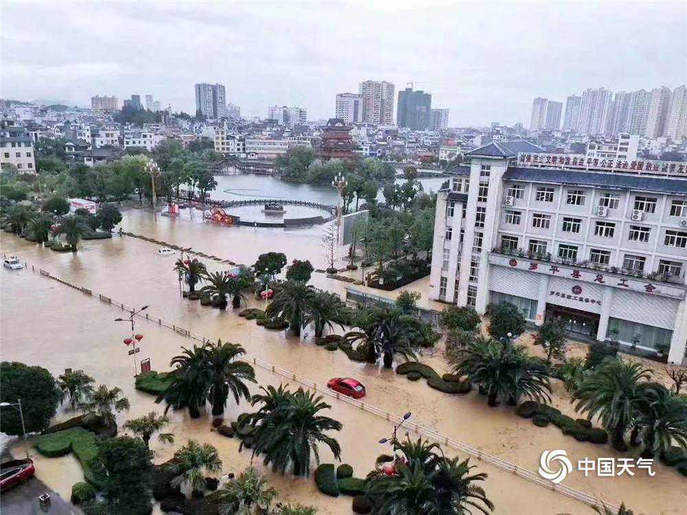 罗平县城遇暴雨袭击,6月14日上午,城市内涝严重。(图/陈小佐)