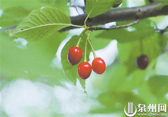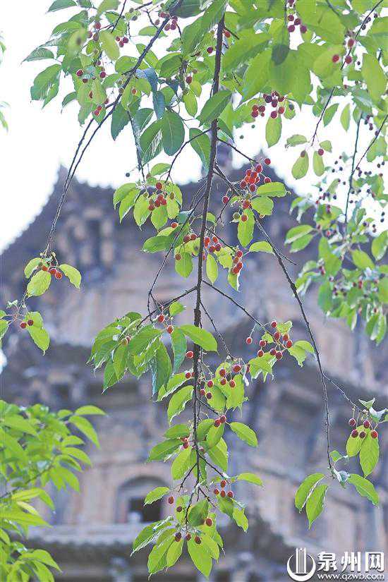昨日,记者来到开元寺西塔边,看到这里结果的樱花树还真不少,树上一串串红果,个头略小,像小粒的红樱桃。有的已变成紫黑色,看上去有点像黑珍珠。不少游客被吸引,拿起手机拍照。