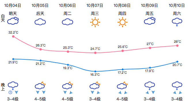 10月5日起,最高气温就会被打回到“3”字头以下,而且接下去还会有逐步下调,10月6日的最低温将降至16.3℃。