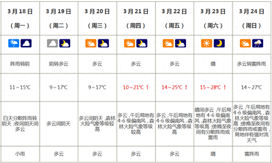 周六至周日(23至24日):晴转多云,午后局地有4-6级偏南风,森林火险气象等级高;傍晚至夜间有分散阵雨或雷雨,局地伴有强对流天气,14~28℃。
