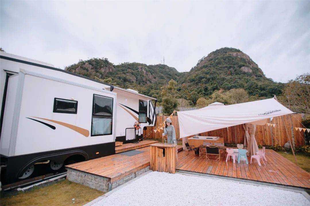 雁荡山建国度假酒店位于雁荡山脚下,引入国际流行的房车露营度假理念,将奢华的住宿空间与原始自然生态环境融为一体,营业以来再创新业态,在原有庭院配备冲浪浴缸、吊椅、天幕等设施的基础上,园区增加恐龙、卡丁车、黄包车、游泳池、滑梯等游乐设施。