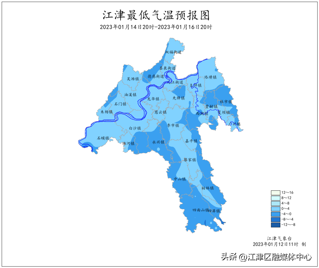 1月13日16时20分,江津区气象台发布“寒潮蓝色预警信号”,预计1月13日20时至15日20时,夏坝镇、贾嗣镇、杜市镇、支坪镇、珞璜镇、四屏镇、中山镇、四面山镇、柏林镇、蔡家镇、嘉平镇、广兴镇、西湖镇、油溪镇、龙华镇、德感街道、吴滩镇、先锋镇、圣泉街道、双福街道、几江街道、鼎山街道、石蟆镇、塘河镇、李市镇、永兴镇、白沙镇、慈云镇、朱杨镇、石门镇48小时内最低气温将下降8℃以上,最低气温小于等于4℃,阵风可达5级以上。