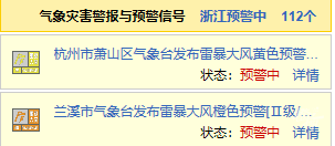 截至17:39,杭州主城区、萧山、临平、钱塘、余杭、富阳等地均已发布雷电黄色预警,淳安已将雷暴大风升级为橙色预警。
