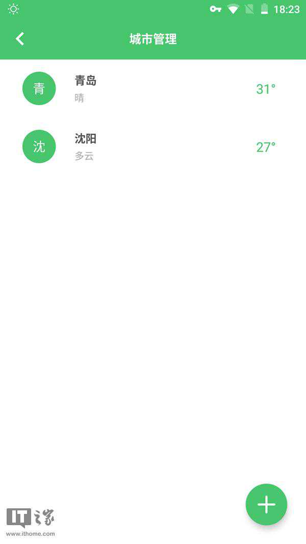 城市管理页面的设计依然延续了Material的设计风格,右下角一个圆形的添加城市的按钮十分瞩目,列表中各城市的图标分别用该城市名称中的第一个汉字来表示。
