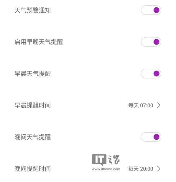 Pure天气确实有推送的行为,然而这些推送并不是无用的垃圾推送,而是天气预警通知和晨间/晚间的天气提醒。你可以自主选择晨间/晚间天气提醒的推送时间,如果你不希望该应用为你主动推送天气信息,则可以将所有的推送开关如数关闭。