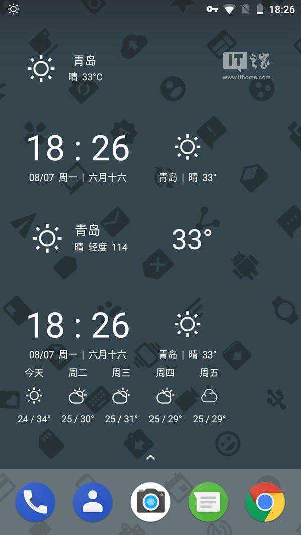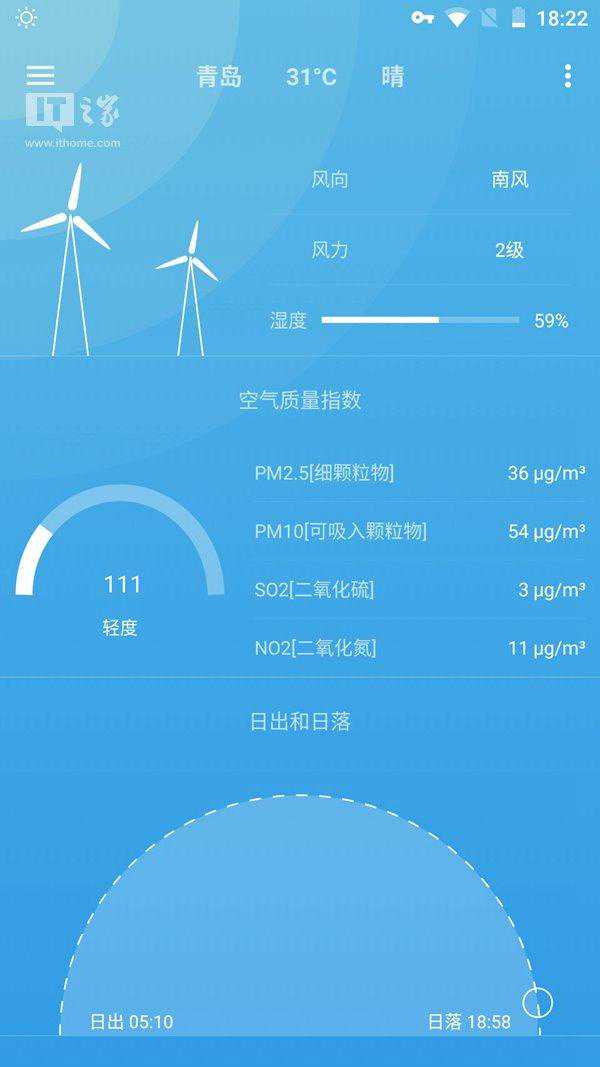 在Pure天气中,不管是应用内的图标、展示天气趋势的图表、空气质量仪表盘还是日出/日落时间仪表盘都采用了极致扁平的设计,与配色清新的动态天气背景相得益彰。