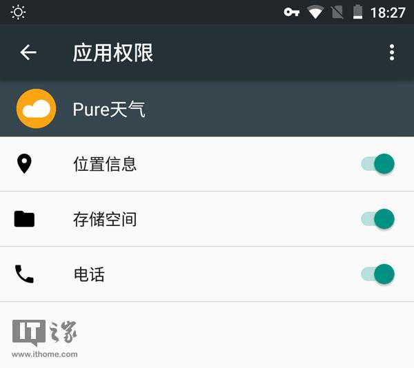 Pure天气一共申请了三个权限,分别是位置信息权限、存储空间权限和电话权限。