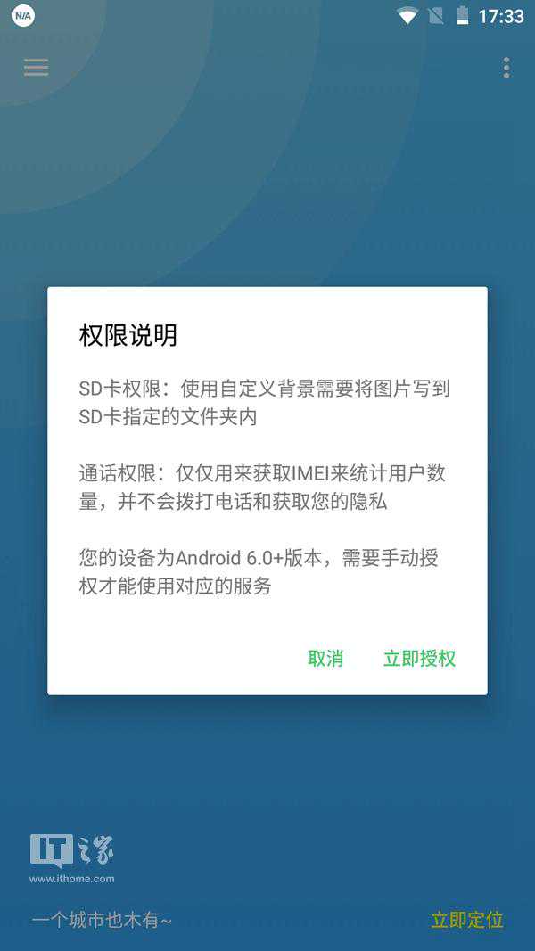 在应用初次启动时,该应用的作者对申请这些权限的原因进行了说明,位置信息权限可以用于对当前城市的自动定位,对于SD卡权限,作者称是为了将自定义背景图片写入到SD卡指定的文件夹中,对于通话权限,作者称是为了统计用户数量,并承诺不会获取用户的隐私。