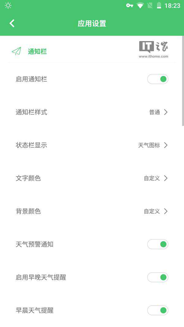 在状态栏图标的选择上,你可以选择天气图标,也可以选择实时温度,不过当将此图标选为实时温度时,字体貌似有点小。当然了,如果你希望你手机的状态栏更加简洁,Pure天气的状态栏图标也可以隐藏。