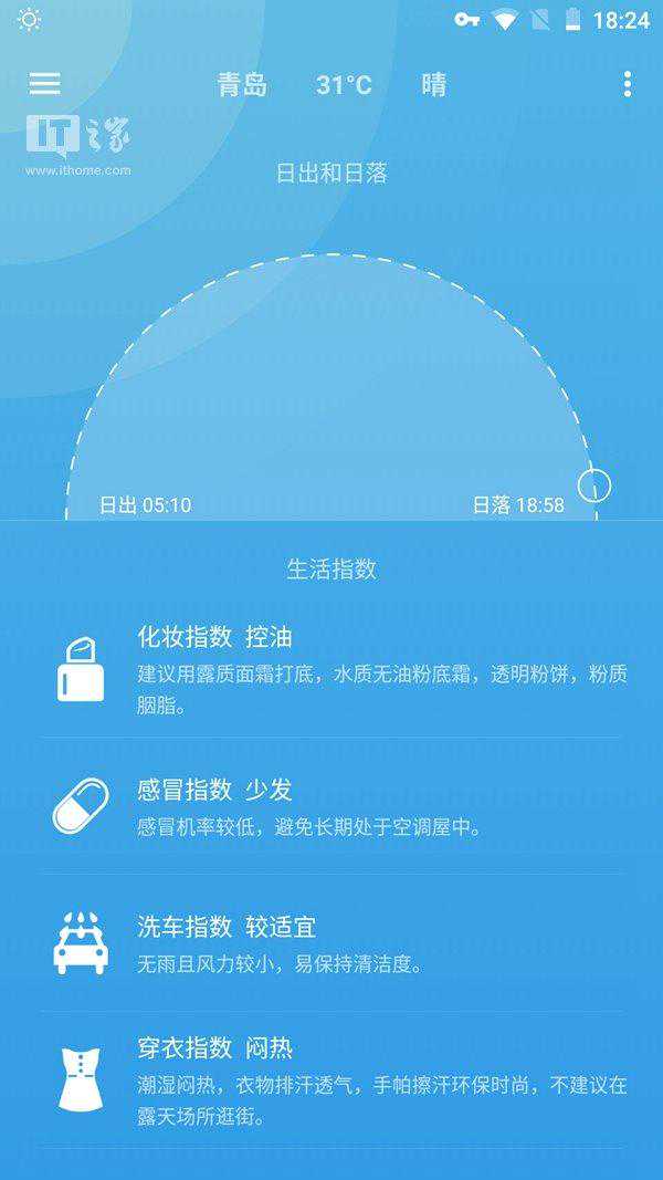 Pure天气主界面显示的天气信息非常全面,有当前体感温度、今天和未来五天的天气预报和降水概率、三小时内的天气预报、风向和湿度、空气质量指数、日出日落时间和生活指数。