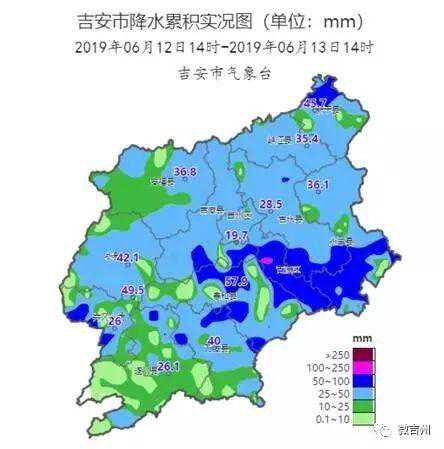 据气象部门介绍,6月12日14时至13日14时,我市普降大雨,部分暴雨,局部大暴雨。全市平均雨量32.1毫米,县(市、区)平均雨量吉安市青原区55毫米最大,永丰县42.3毫米次之。点最大降雨为青原区渼陂村站124.1毫米,其次为永丰县北寨村站105.6毫米,第三井冈山市大陇站95.5毫米。共9县(市、区)65站(17.0%)降雨超过50毫米;2县(市、区)2站(0.5%)降雨超过100毫米。