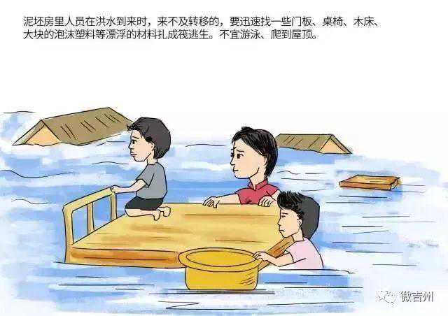 3、扎筏逃生,勿游泳、爬屋顶。