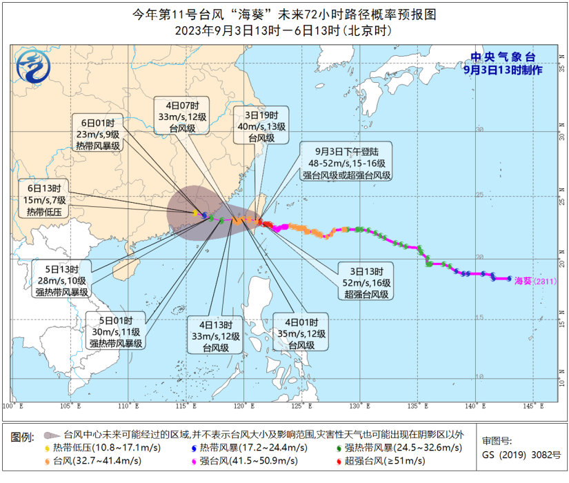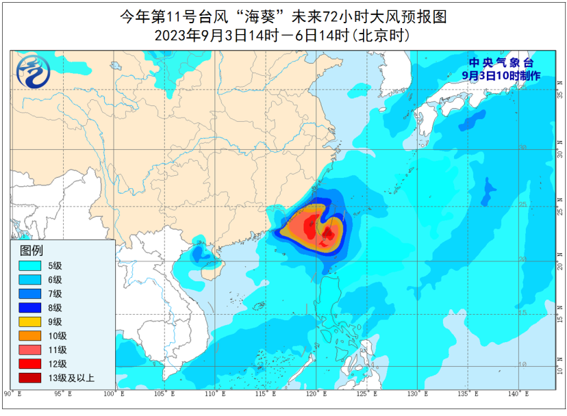 大风方面,预计9月3-6日,巴士海峡、台湾海峡、台湾以东洋面、东海南部及钓鱼岛附近海域、南海东北部偏北海域及台湾岛沿海、浙江南部沿海、福建沿海、广东东部沿海将有6至8级、阵风9至10级大风,部分海域或地区的风力有9至12级,阵风13至14级,“海葵”中心经过的附近海面或地区的风力有13至16级,阵风17级。