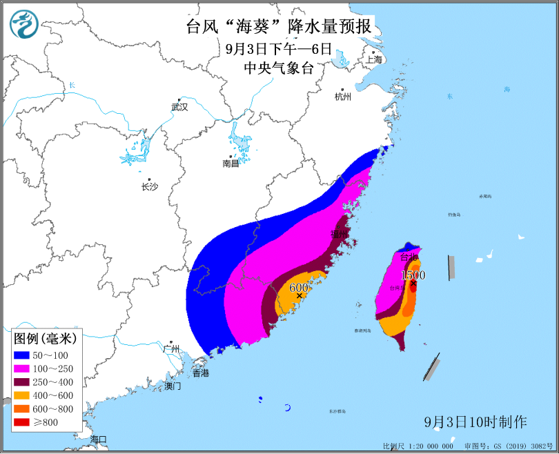 受其影响,9月3日下午至6日,台湾、福建及广东等地将有持续性强风雨影响,福建东南部累计降雨量有400毫米至600毫米,单点可达600毫米以上;台湾岛东部和南部部分地区400毫米至800毫米,局地可达1500毫米以上。