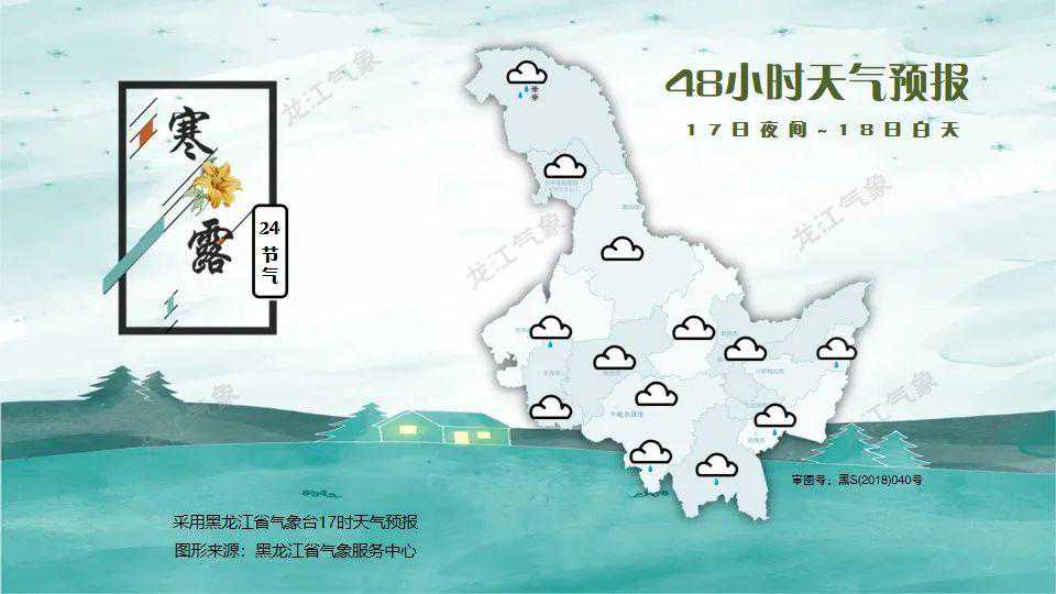 17日夜间到18日白天:大兴安岭北部多云有雨夹雪,齐齐哈尔、大庆北部、哈尔滨南部、双鸭山东部、七台河、鸡西、牡丹江多云有阵雨,其它地区多云。