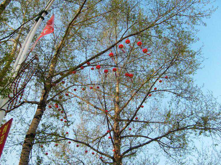 ————这个季节,乌伊岭街边的杨树叶子还没有完全展开,嫩绿的一派柔柔春色。树上挂着小红灯笼,很是温馨。