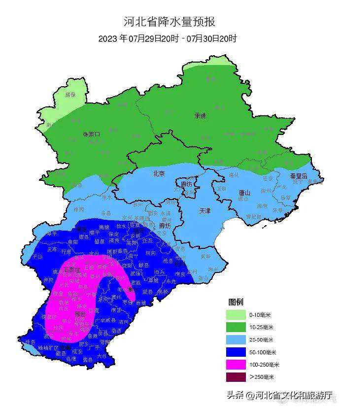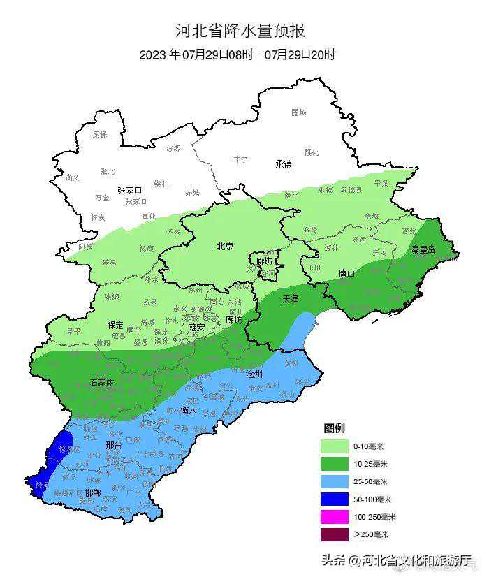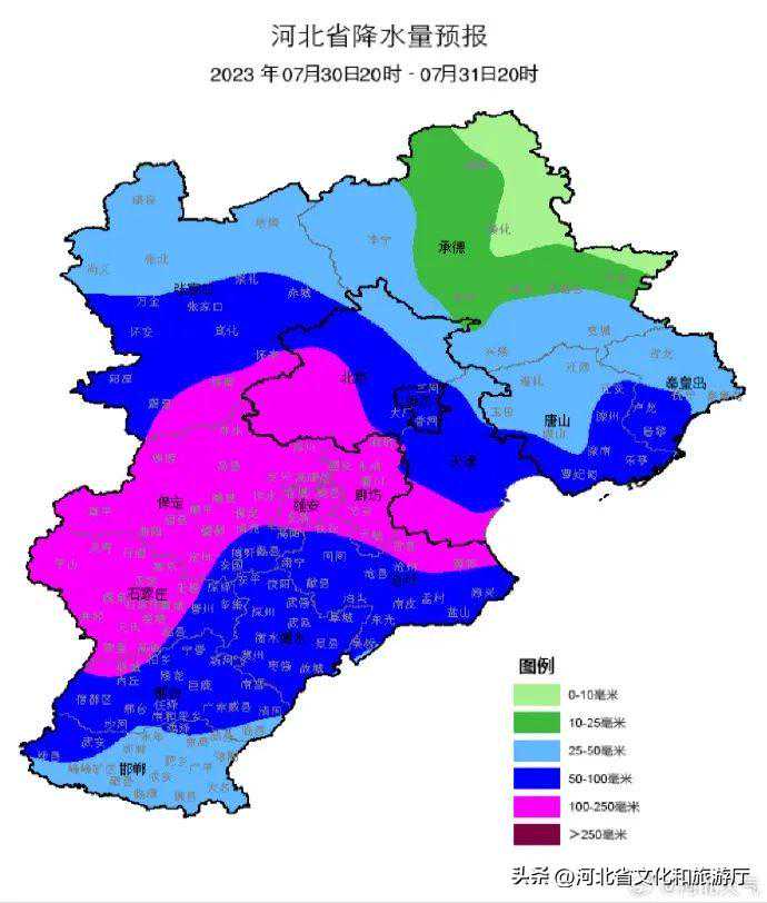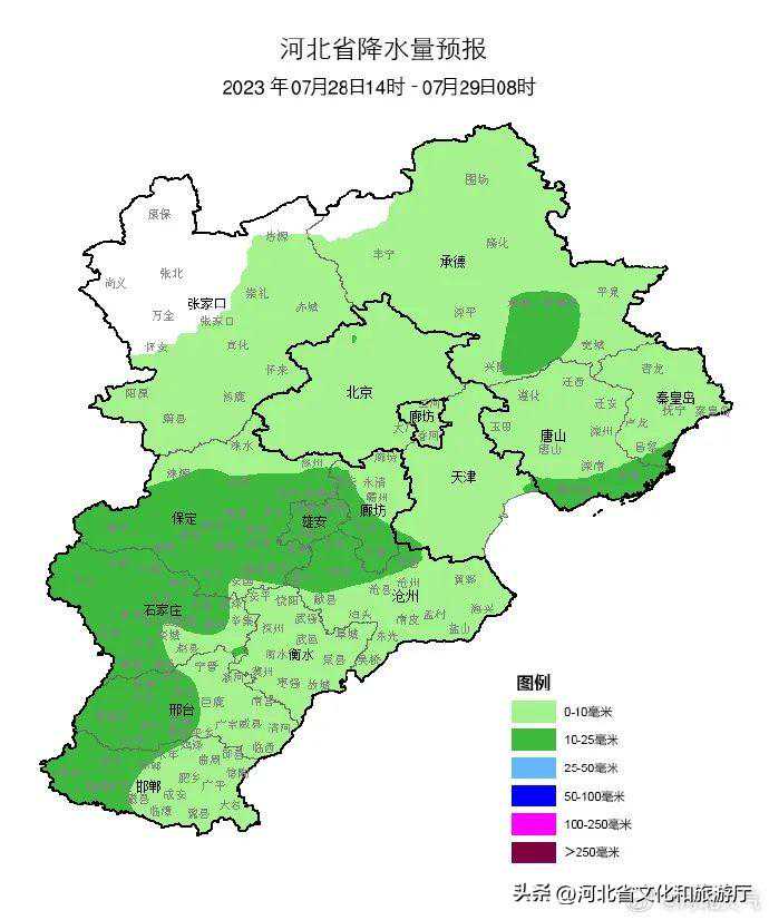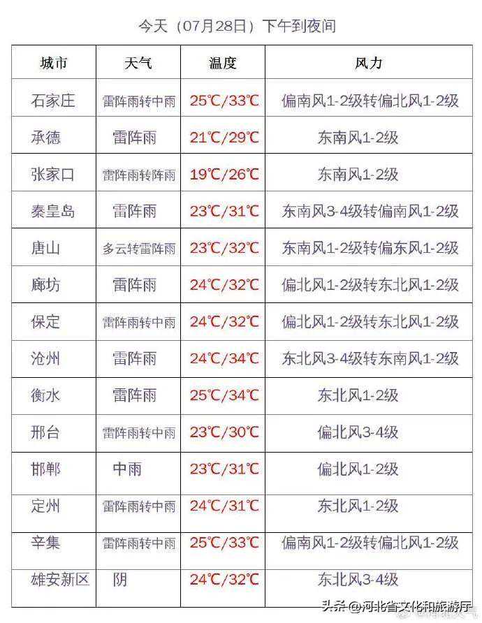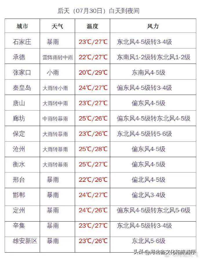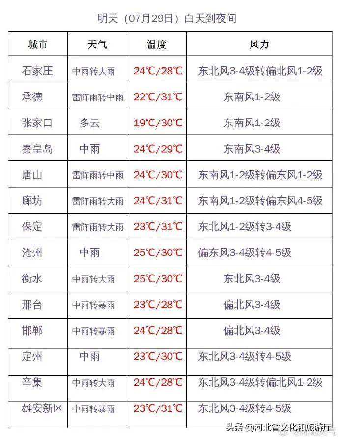 明天夜间到7月30日,全省阴,大部分地区有中雨,其中保定、廊坊及以南地区有大雨,部分地区有暴雨,个别地点有大暴雨,雷雨时局地伴有短时强降水、短时大风等强对流天气。