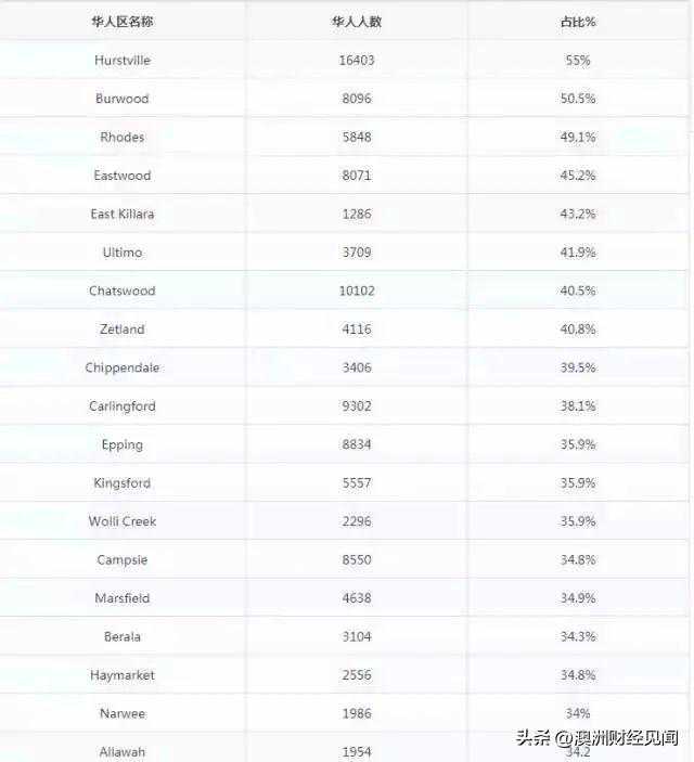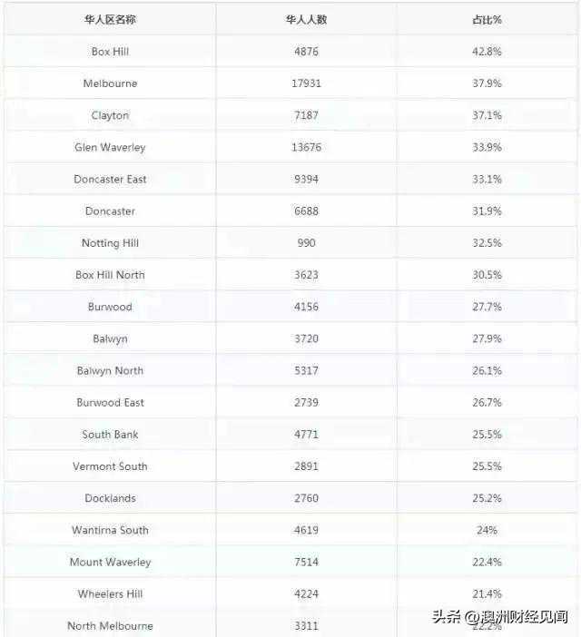 在悉尼,华人占比超过40%的区域有8个,已经达到了50%以上,而墨尔本华人占比超过40%的只有BoxHill,其他区华人占比也都在20%-35%左右。