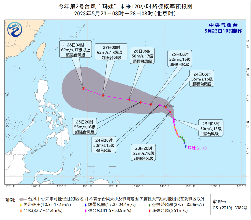 据中央气象台消息,今年第2号台风“玛娃”(Mawar)(强台风级)的中心今天(23日)上午8点钟(北京时,下同)位于美国关岛东南方向大约340公里的西北太平洋洋面上,就是北纬11.1度、东经146.8度,中心附近最大风力有15级(50米/秒),中心最低气压为940百帕,七级风圈半径300—360公里,十级风圈半径90公里,十二级风圈半径40—50公里。