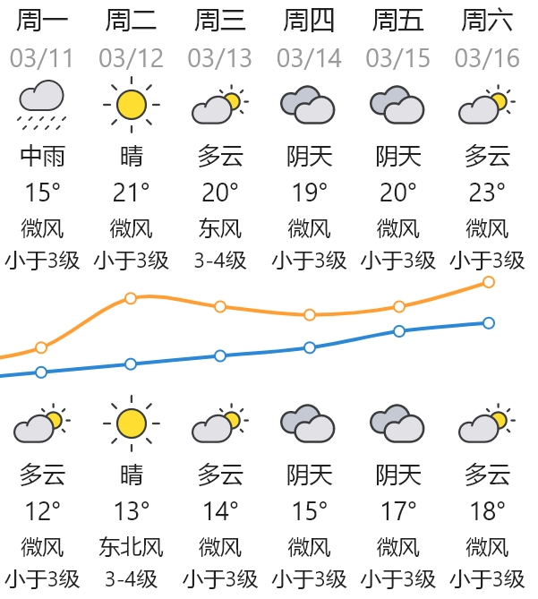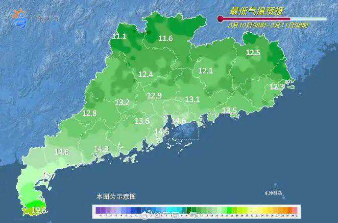 10日-11日白天,粤北、肇庆有中雨局部大雨或暴雨,其余市县阴天有小雨。最低气温:粤北偏北市县10℃~12℃,粤西和珠三角南部市县15℃~18℃,其余市县12℃~14℃。
