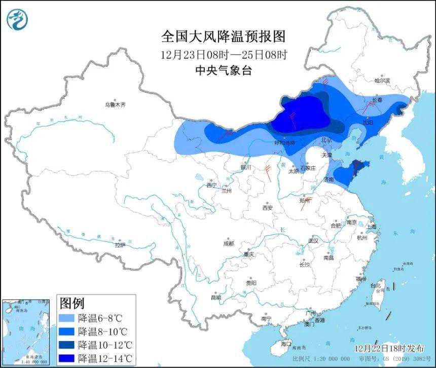 受寒潮影响,预计,12月23日至26日,我国中东部地区自北向南将先后出现4~5级风,阵风6~8级;气温下降6~10℃,其中,内蒙古中西部、华北北部和西部、黄淮东部、江淮东部、江南东部以及贵州东部、湖南西部等地的部分地区降温12~14℃,局地14℃以上;28日前后,最低0℃线将位于江南南部至贵州南部一带。此外,我国东部和南部海域将先后有7~8级风,阵风9~10级。