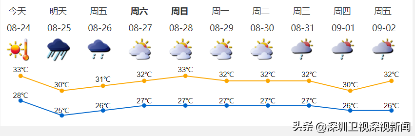 今日(24日)深圳高温炎热,午后转强雷雨,夜间风雨逐渐加大。25-26日有暴雨局部大暴雨,阵风10-12级,风雨最强时段出现在25日凌晨至白天,26日白天风雨减弱。