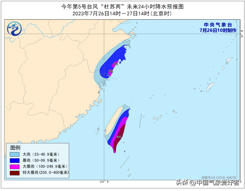 中央气象台指出,26日14时至27日14时,浙江东部、台湾岛等地部分地区有大到暴雨,其中,浙江东南部沿海等地部分地区有大暴雨(100~150毫米),台湾岛东部和南部部分地区有大暴雨到特大暴雨(250~400毫米)。