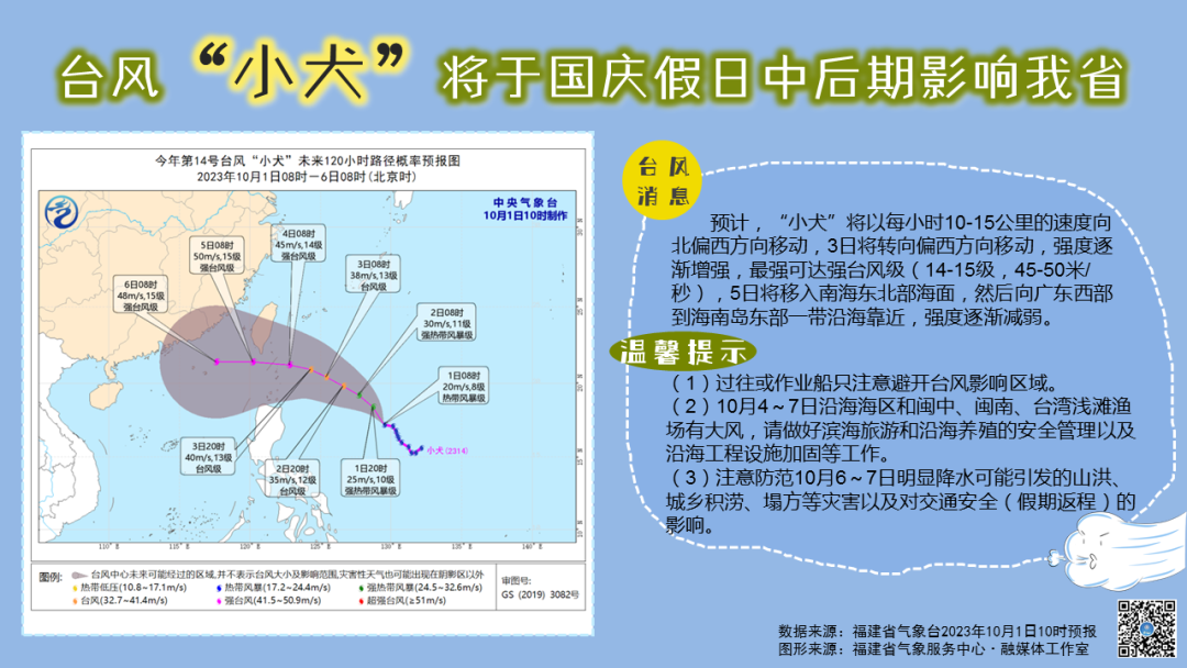 预计,“小犬”将以每小时10-15公里的速度向西北方向移动,逐渐向台湾以东洋面靠近,强度逐渐增强,最强可达超强台风级(16-17级,52-58米/秒),将于5日早晨至上午登陆台湾东南部沿海,登陆后向偏西方向移动,进入南海东北部,强度逐渐减弱。
