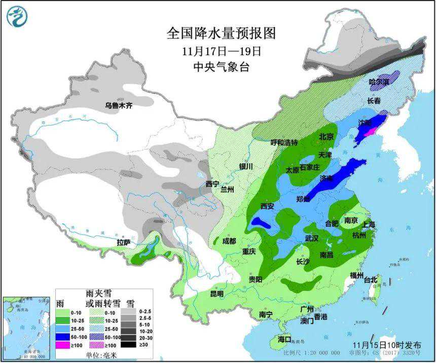 11月17日至19日,我国中东部地区将迎来一轮大范围强雨雪、大风降温天气。此次天气过程雨雪范围广、强度强、局地日降水量可能突破历史同期极值。江淮等地有大雨。气象专家提醒:此次雨雪过程影响范围广且具有一定的极端性,需提高警惕。