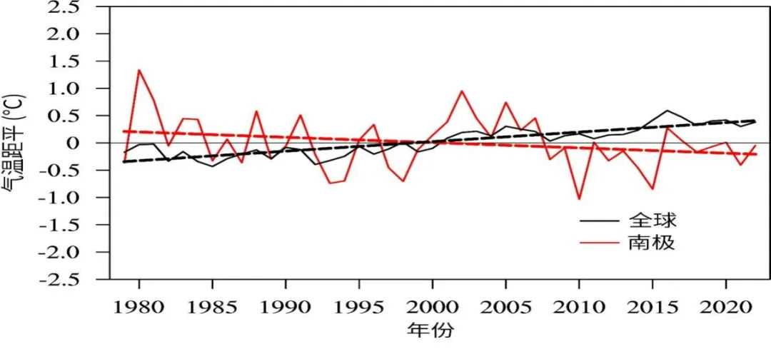 1979−2022年南极(红线实线)和全球(黑线实线)平均近地面年平均气温距平(相对于1991−2020年),虚线为年平均气温距平趋势。