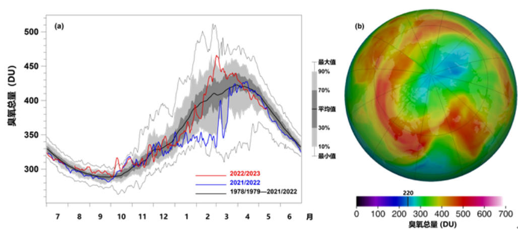 (a)北极(63°N以北)臭氧总量季节变化,红色为2022年下半年到2023年上半年,蓝色为2021年下半年到2022年上半年,黑色为1978−2021年气候态平均(b)2022年北极臭氧损耗空间分布,其大致为蓝色区域。