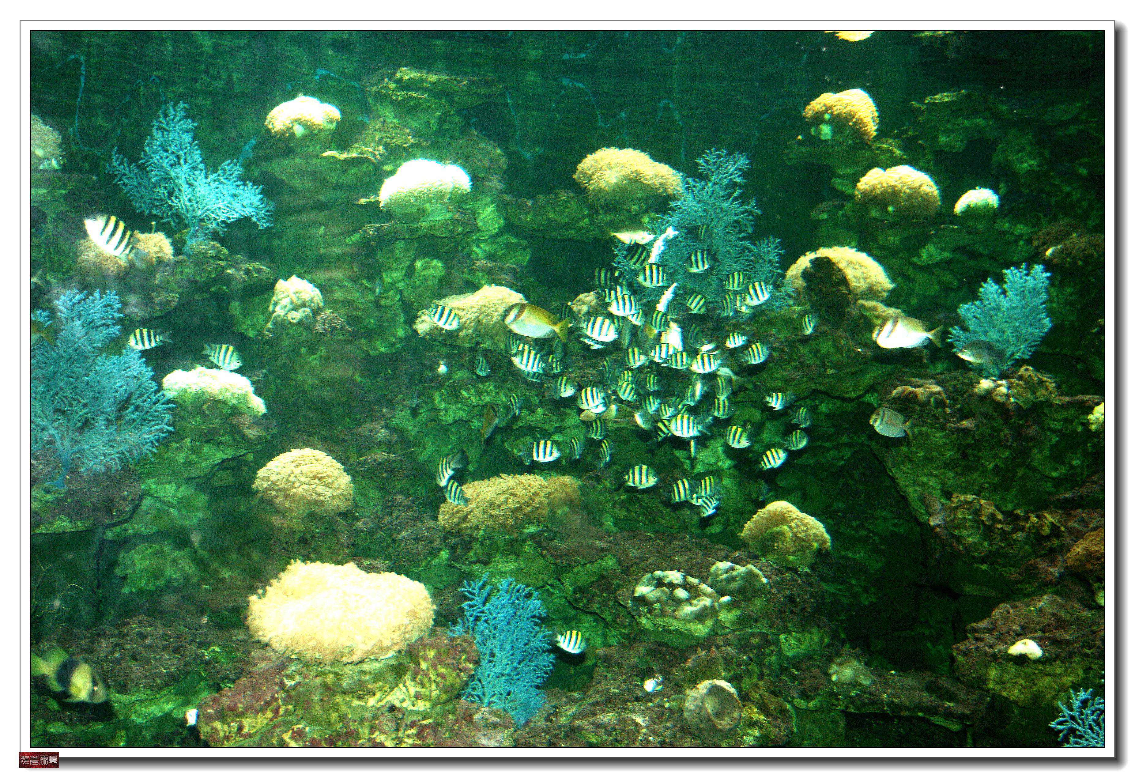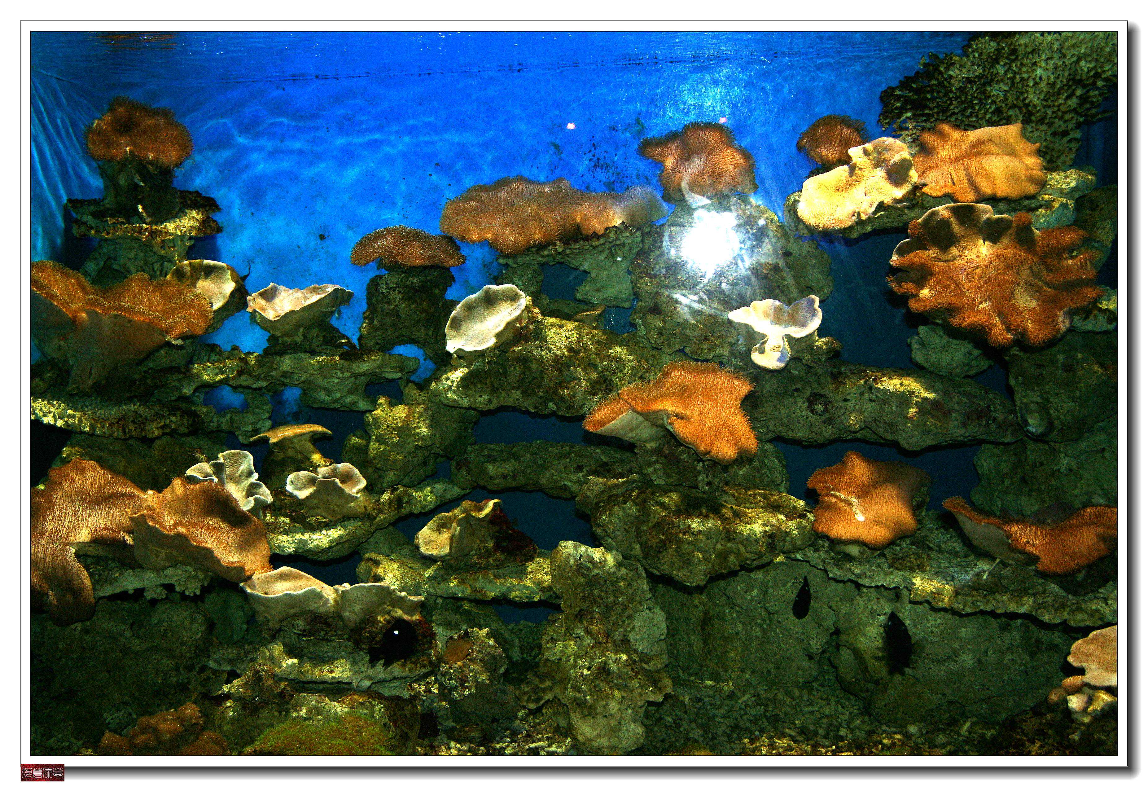 目前世界上最大最全的活体珊瑚展示缸,环型展缸长达28米,高3米,国内顶级活体珊瑚养殖技术,展示156个品种,2600多朵来自世界各地五彩斑斓的活体珊瑚,通过调节水质、水温、光线来控制其舒展和休息时间,让大家不必潜水冒险就能轻松地欣赏神秘绚烂的活体珊瑚,就算渔民在海上工作一辈子也不曾见过如此壮观的珊瑚。展缸同时模拟了珊瑚的生态环境,展示了300多种热带观赏鱼。展缸总水体超过一千吨。