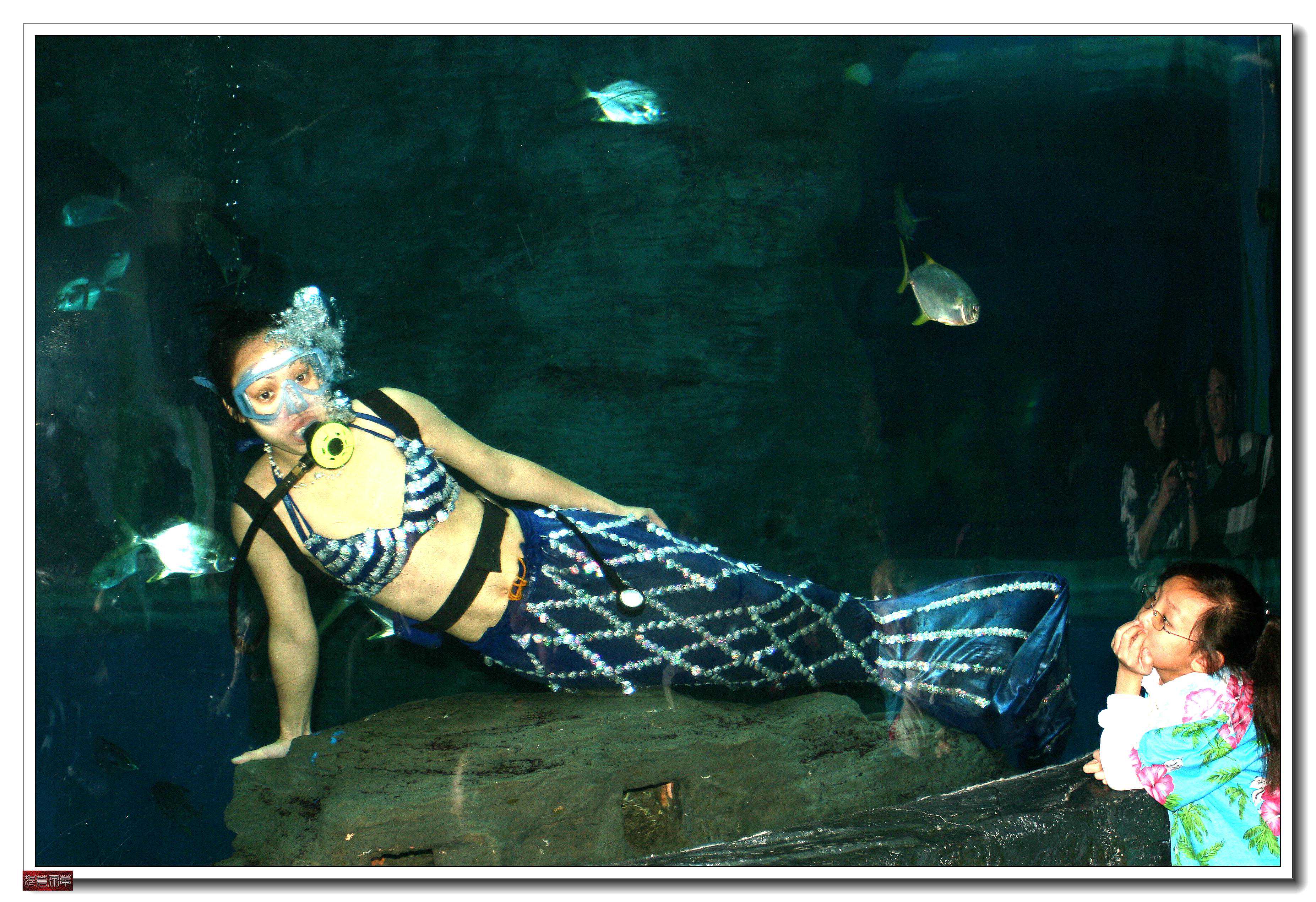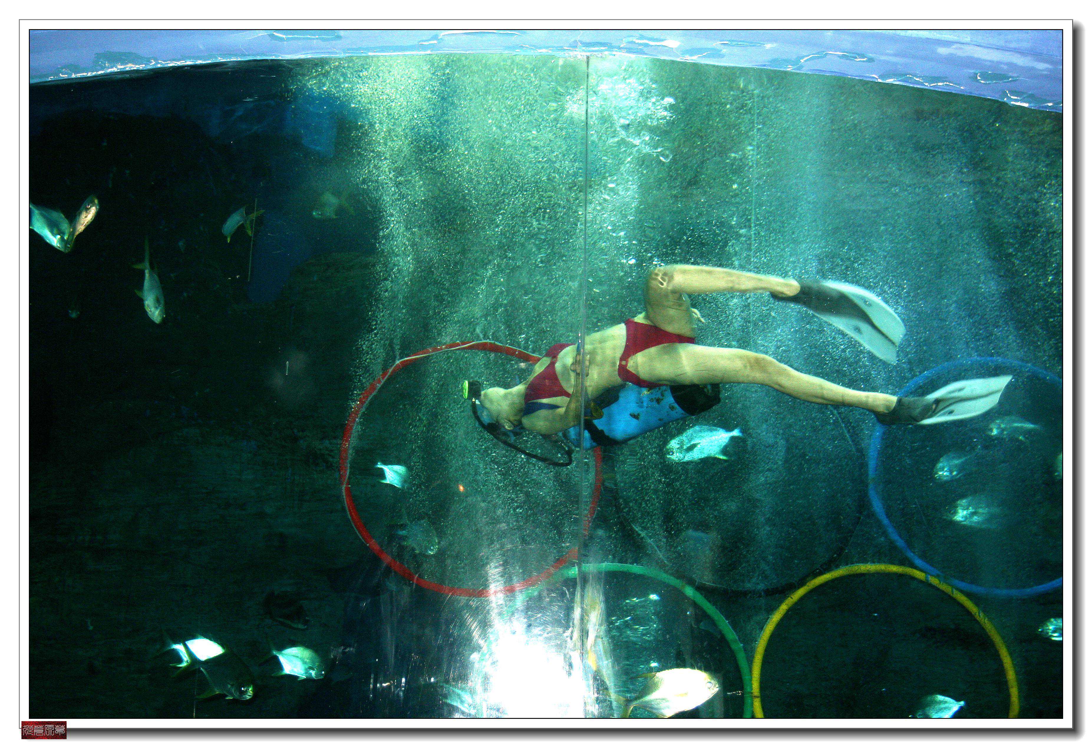 海洋剧场(当时有人与鲨共舞表演,每天6场)。目前是国内最大的水族展缸,创四项之最:最大—圆缸直径长达11米;最深—缸体高达13米,有三层楼体的深度;最重—缸内水体超过1000吨;最奇—四面通透的缸体隧道从圆缸中部直穿而过。欣赏人鲨共舞、奥运之风、美人鱼等精彩表演,体验人与自然和谐共处典范。