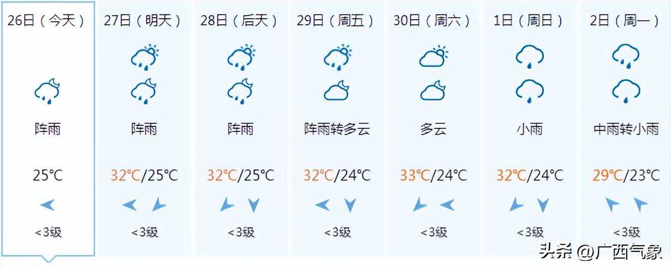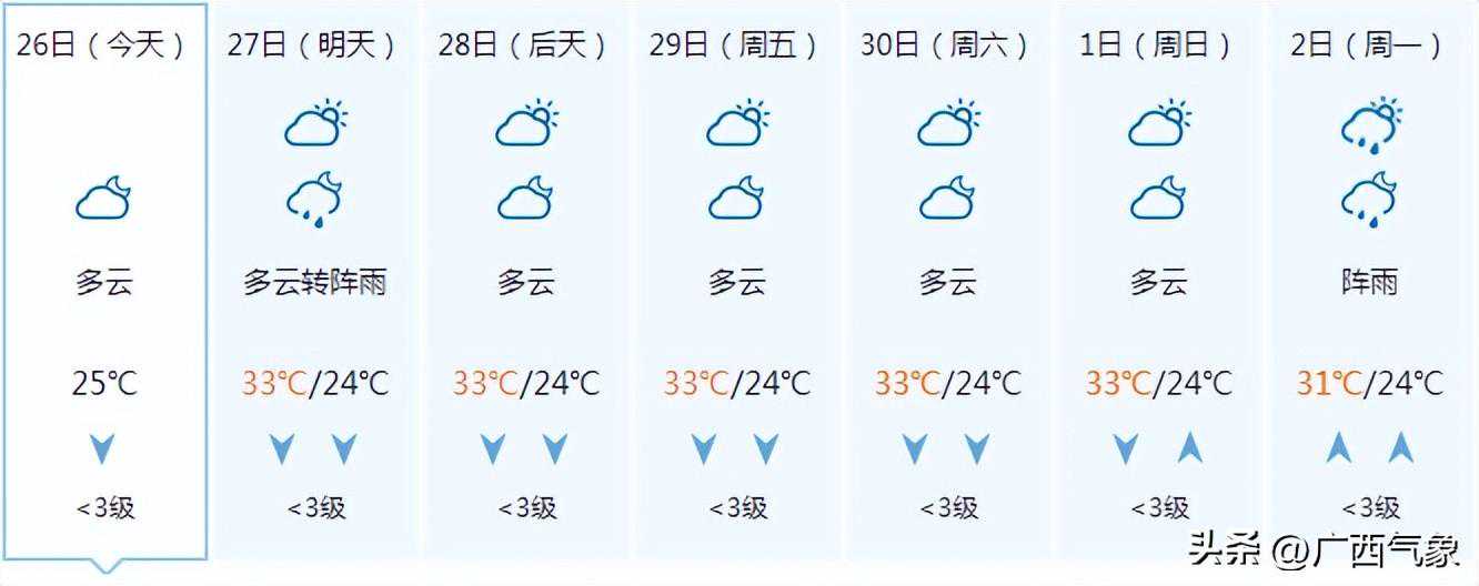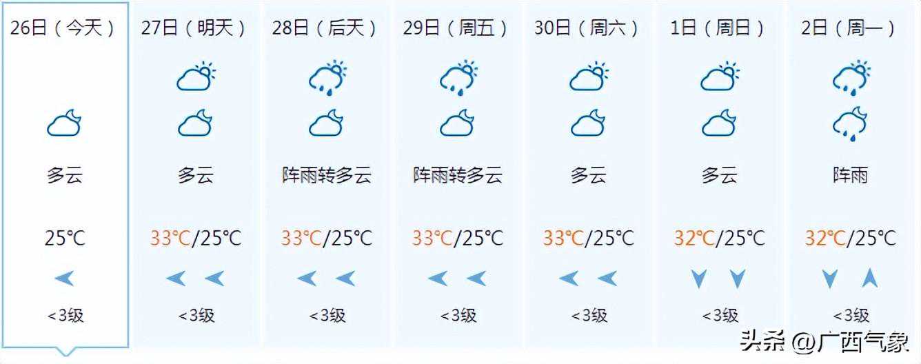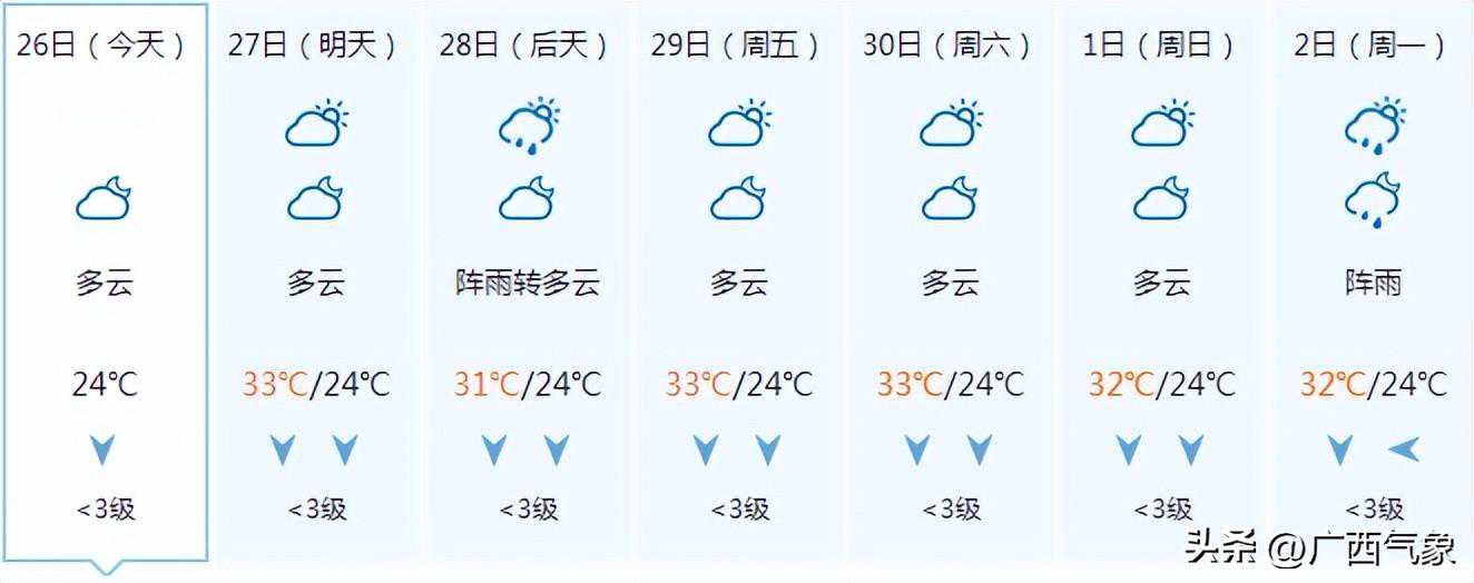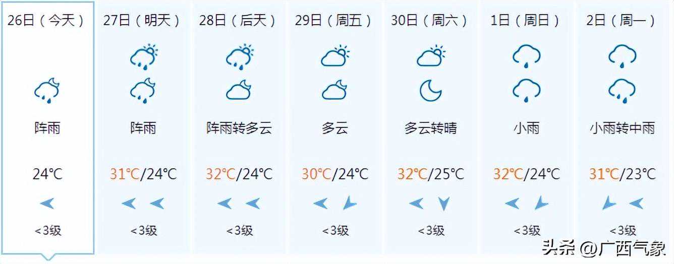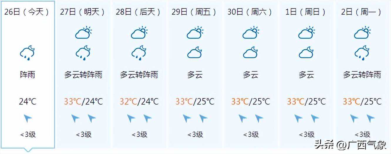 南宁市:今天晚上阴天、局地有阵雨,明天白天多云有阵雨,偏东风1~2级,最低气温24℃,最高气温33℃。