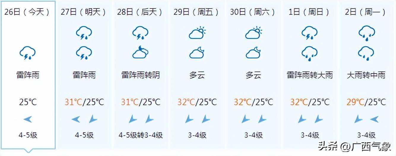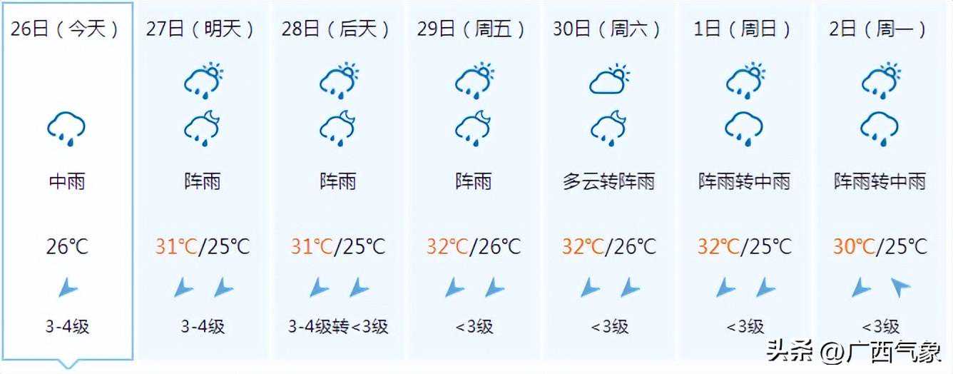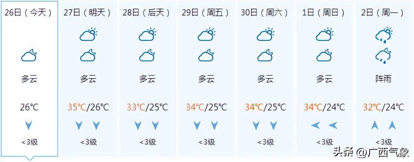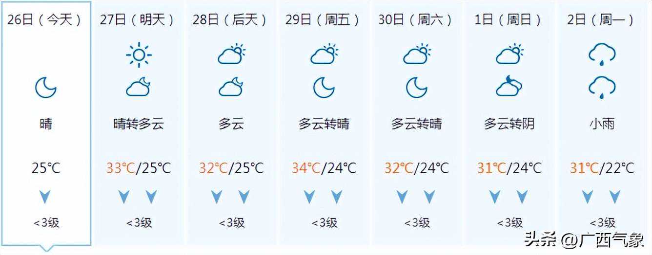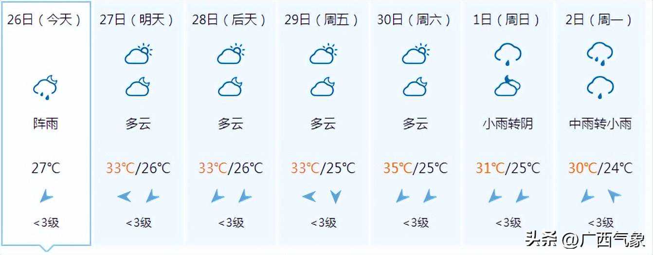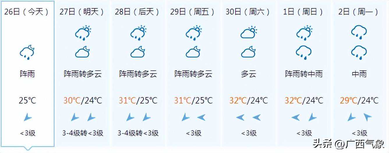 南宁市:今天晚上阴天、局地有阵雨,明天白天多云有阵雨,偏东风1~2级,最低气温24℃,最高气温33℃。