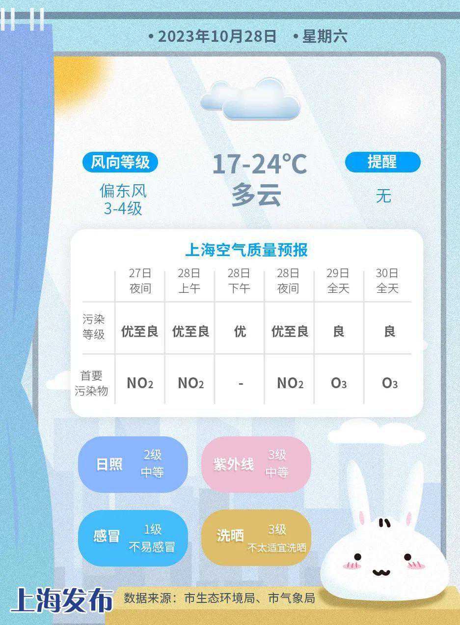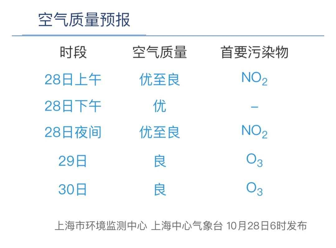 10月28日9时,闵行区AQI为38,优。昨天AQI为75,良,首要污染物臭氧。据上海市环境监测中心预报,今天下午优,夜间优至良,明天良,后天良。