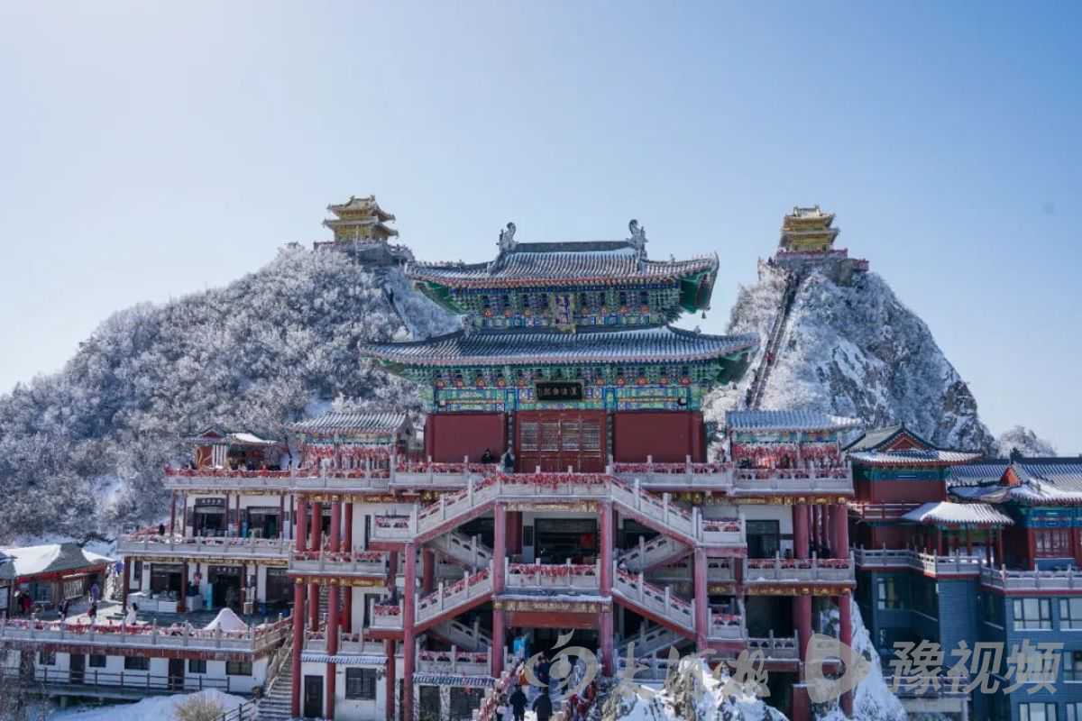 洛阳栾川老君山原名景室山,是秦岭余脉八百里伏牛山的主峰,海拔最高2217米,山顶冲破天际,周遭云海此起彼伏。每年冬季,尤其是雪后的老君山金顶,红墙绿瓦、金顶崖体间,满是雾凇雪挂、玉树琼枝,仿若回到千年前。