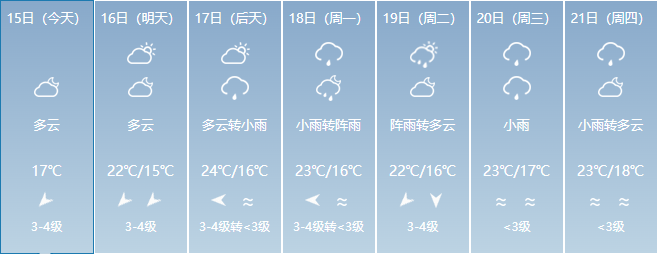 17日:多云,东北风3~4级、阵风5~6级减弱到2~3级,气温:17~23℃;