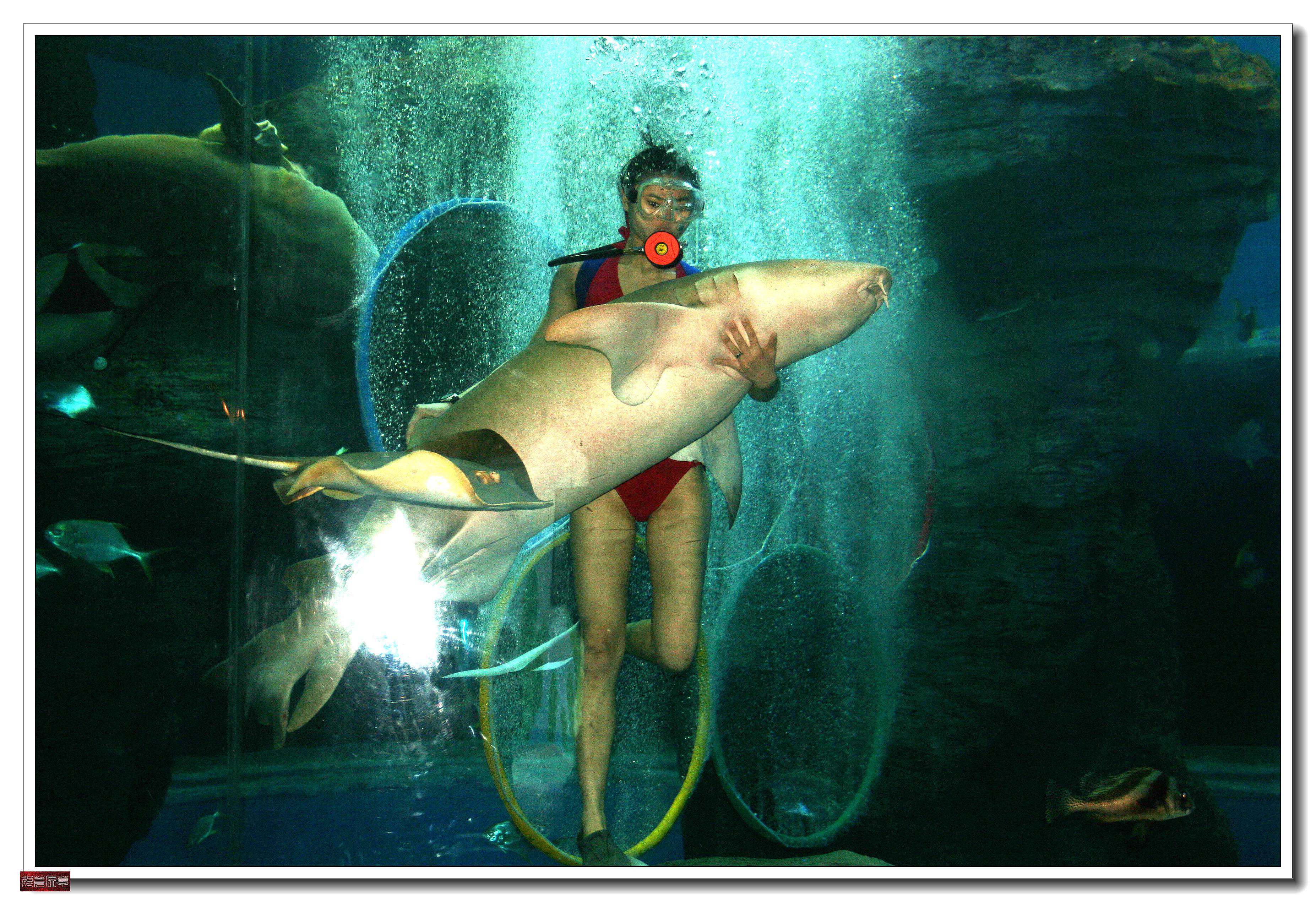 海洋剧场(当时有人与鲨共舞表演,每天6场)。目前是国内最大的水族展缸,创四项之最:最大—圆缸直径长达11米;最深—缸体高达13米,有三层楼体的深度;最重—缸内水体超过1000吨;最奇—四面通透的缸体隧道从圆缸中部直穿而过。欣赏人鲨共舞、奥运之风、美人鱼等精彩表演,体验人与自然和谐共处典范。