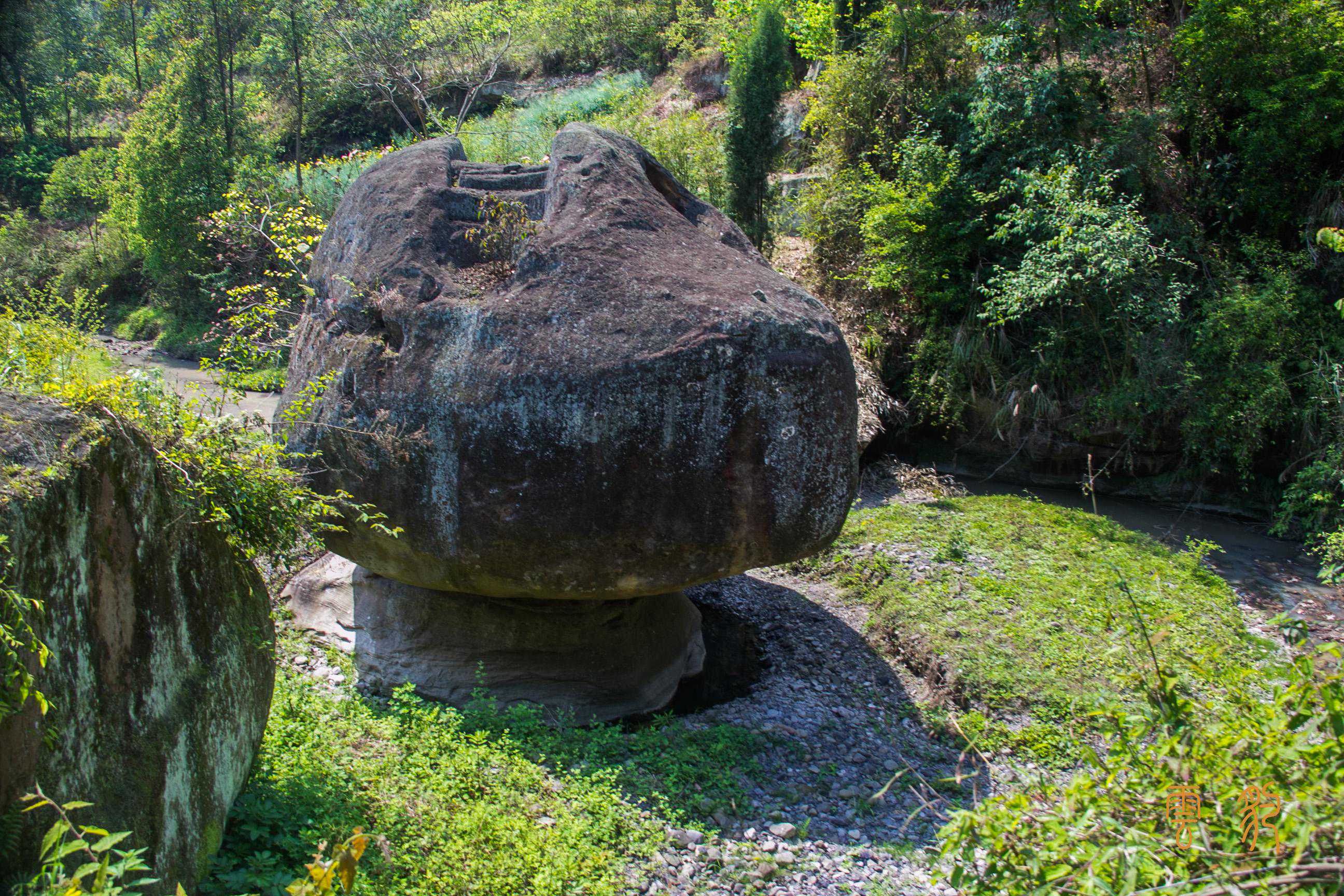 杨家砦砦门下溪水边,那坨传说会被溪水冲刷旋转的石头,石头上还凿有阶梯,说明古人也对这石头有兴趣