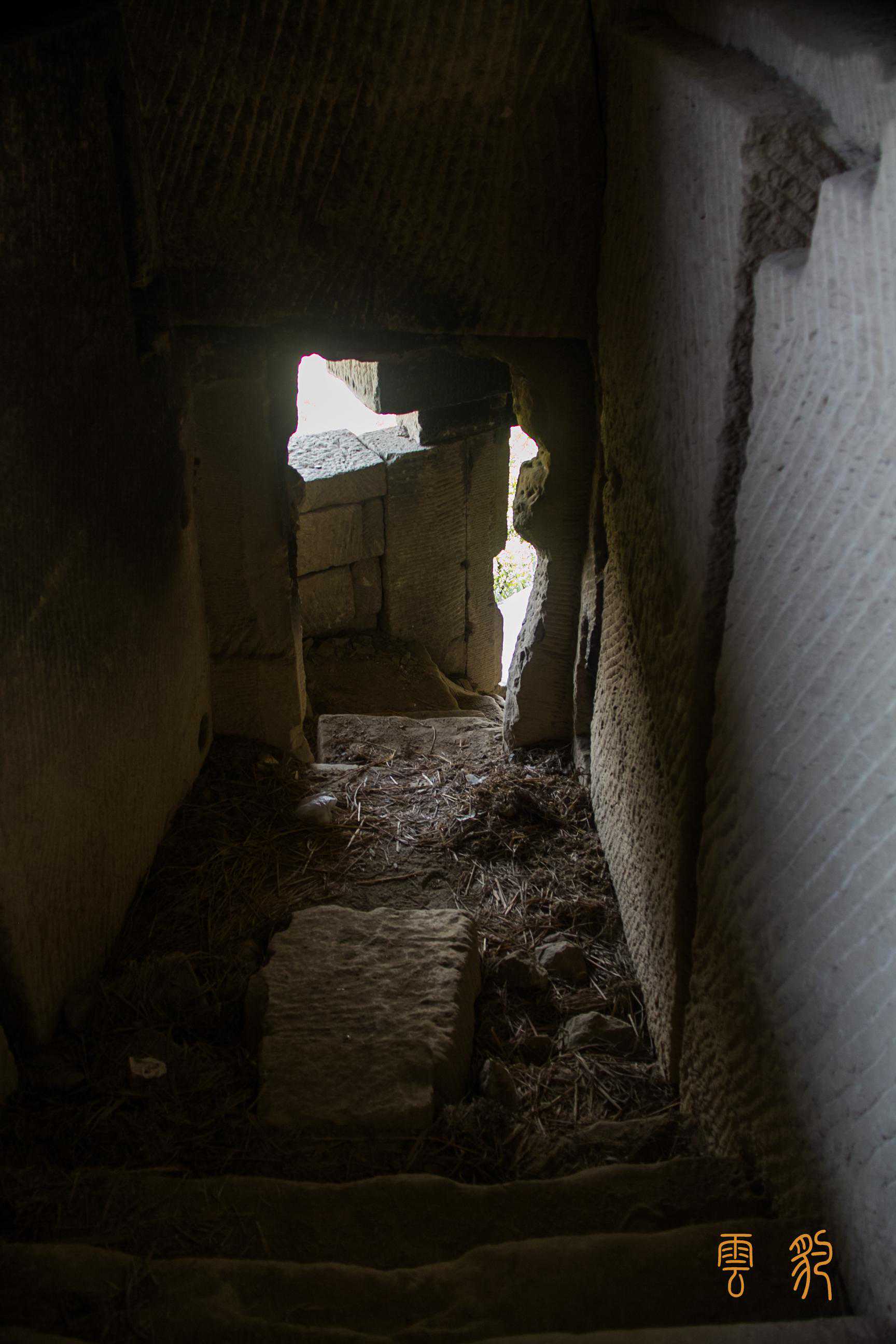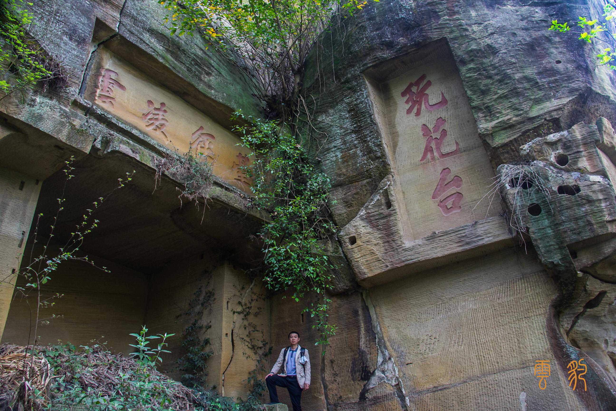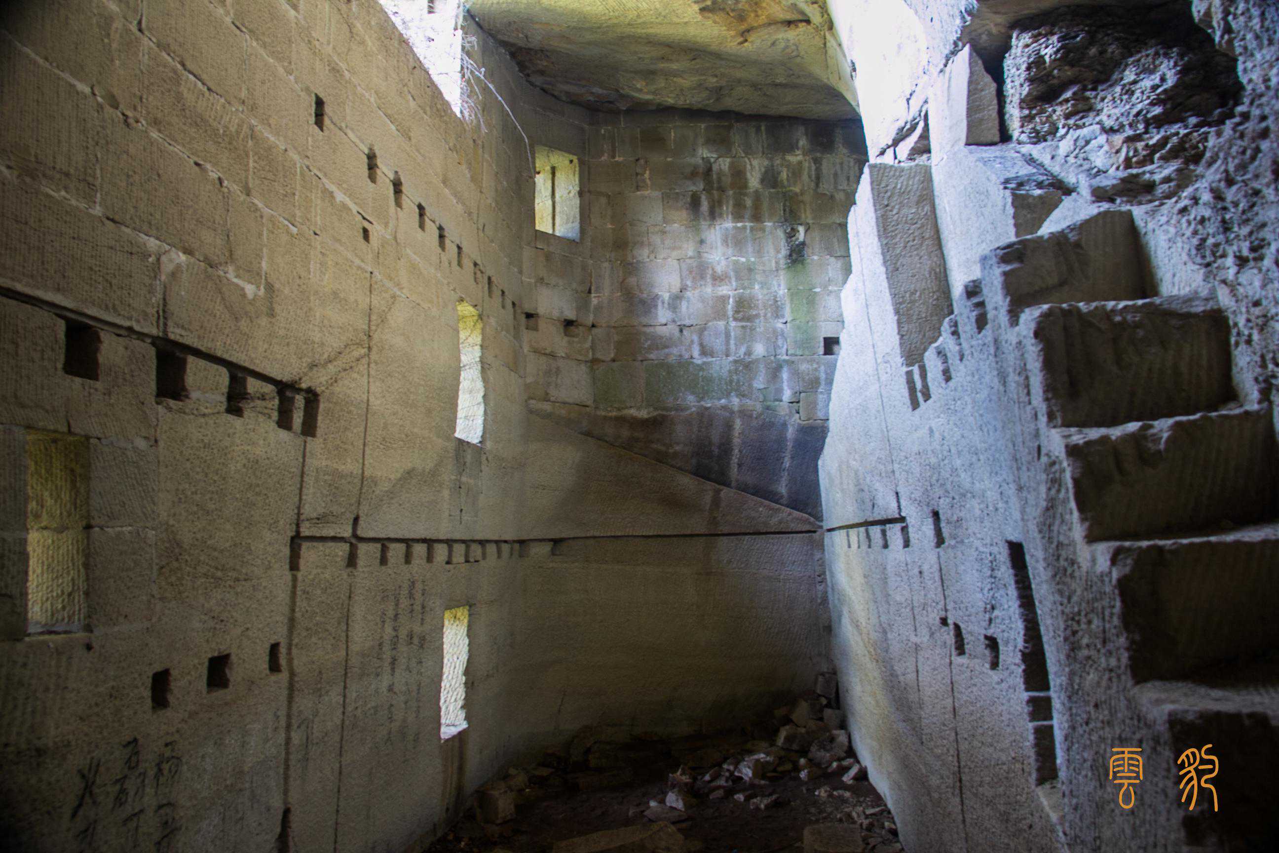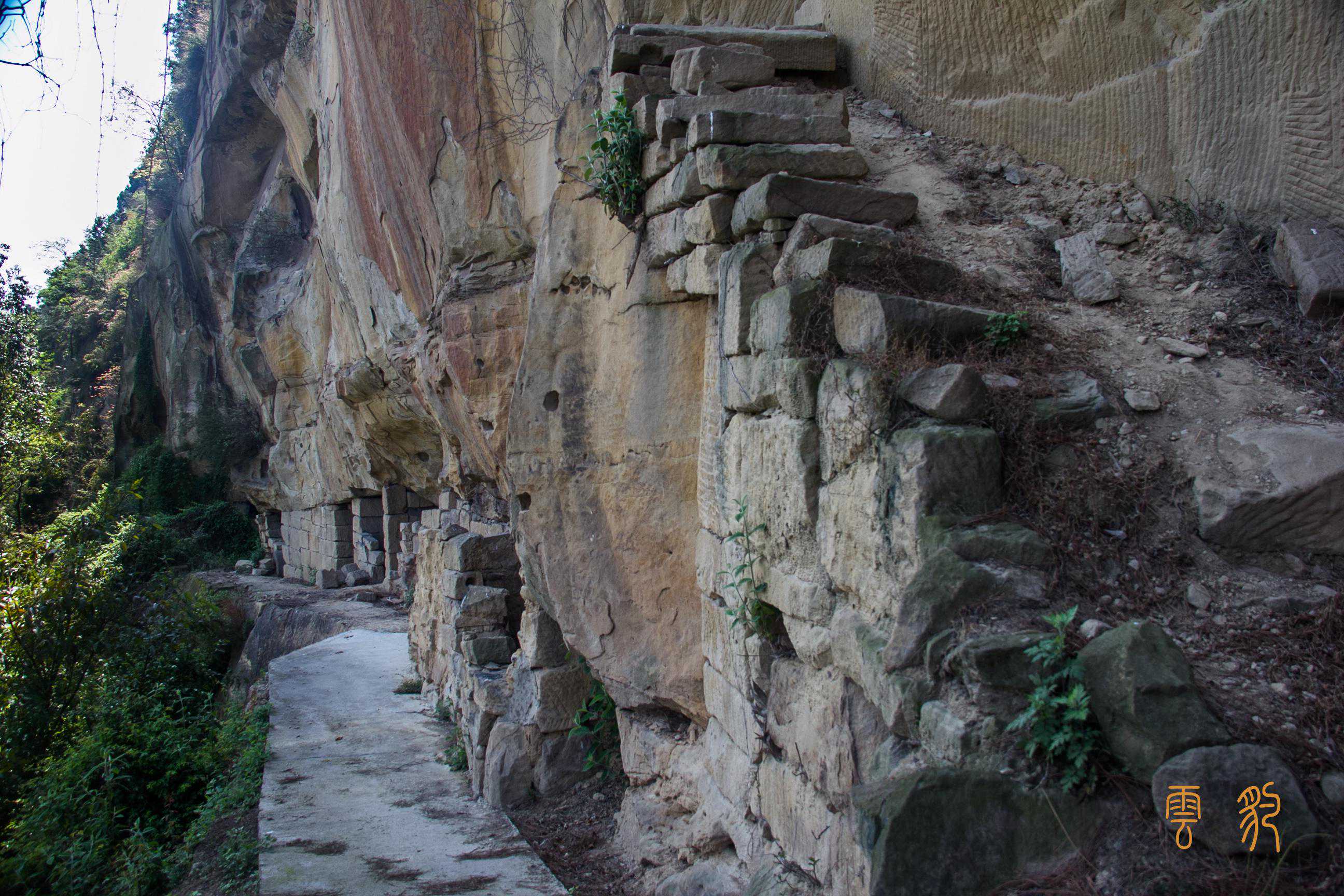 这是杨家石室里最大的一间石室,三层石室的分配,让空间得以充分利用;石室外面的悬崖上,刻有“天宝亭”三个大字。从石室的条石痕迹可以看出,这上面的石室墙壁及窗户,全是条石垒砌而成