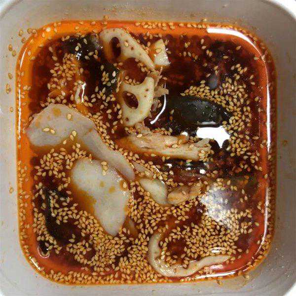最后打开盖子,咦,像这么回事哦!的确是冷串的形式,味道和口感是钵钵鸡麻辣的感觉。