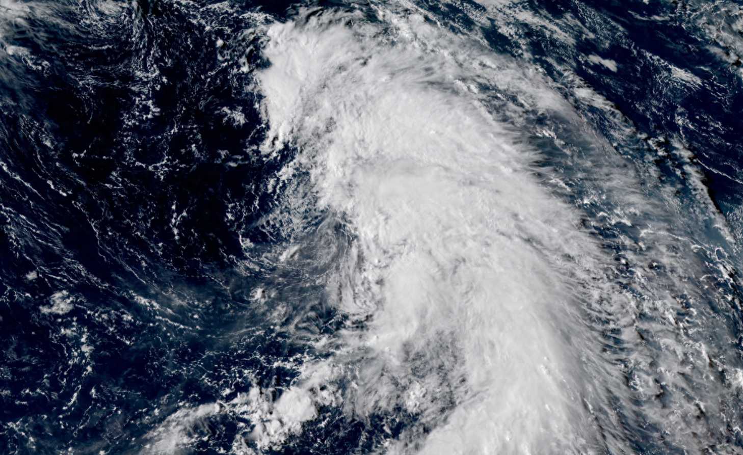 左侧为台风云雀,右侧为另一个台风胚胎91W,两者的相互作用可能导致云雀路径产生波动。
