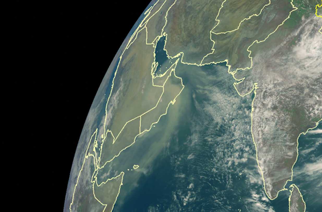 风云4号卫星云图显示,在阿拉伯半岛,狂暴的大风吹起沙尘暴,将大量黄沙吹向阿拉伯海,黄沙在蓝色的海面上格外引人注目。