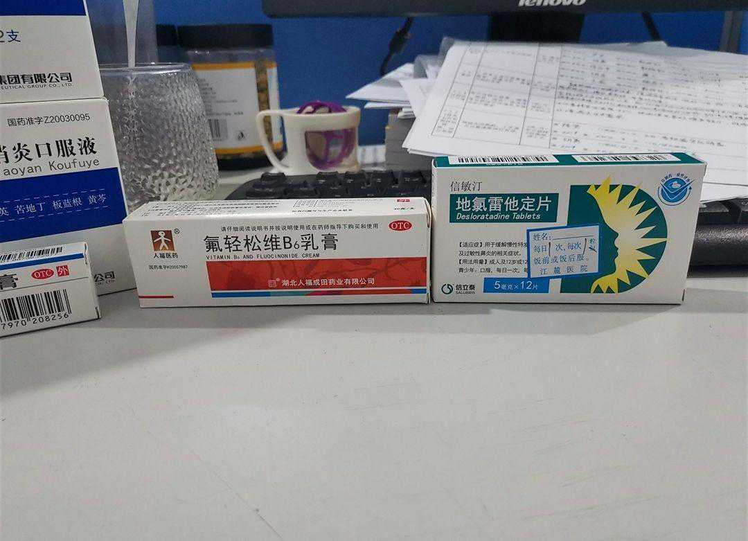 4.7下午请假去公司附近医院挂了个外科,皮肤科曾医生给看了,说是过敏,给开了蒲地蓝、地氯雷他定片、阿昔洛韦乳膏和氟轻松维B6乳膏。这样,内服外用过了几天,确实好了很多。