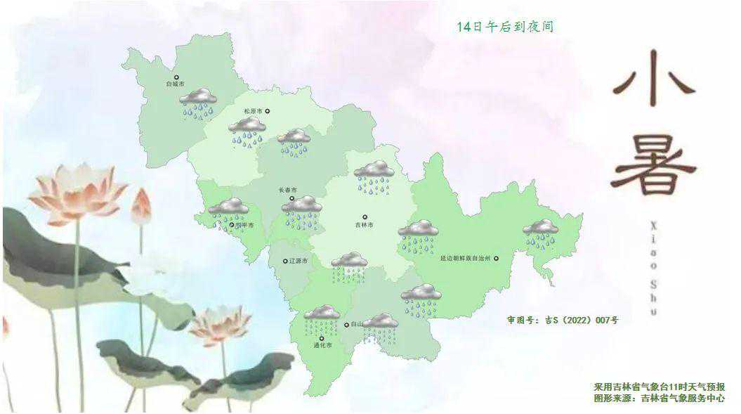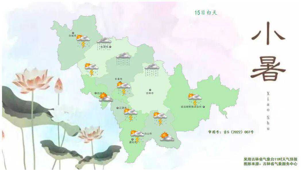 明天白天,全省多云有时阴,松原北部、长春北部、吉林北部有中雨,部分地方有大雨,并伴有短时强降水、雷暴大风或冰雹等强对流天气,白城、松原南部、长春南部、辽源东部、吉林南部、通化、白山西部和北部、延边、长白山保护区有阵雨或雷阵雨。