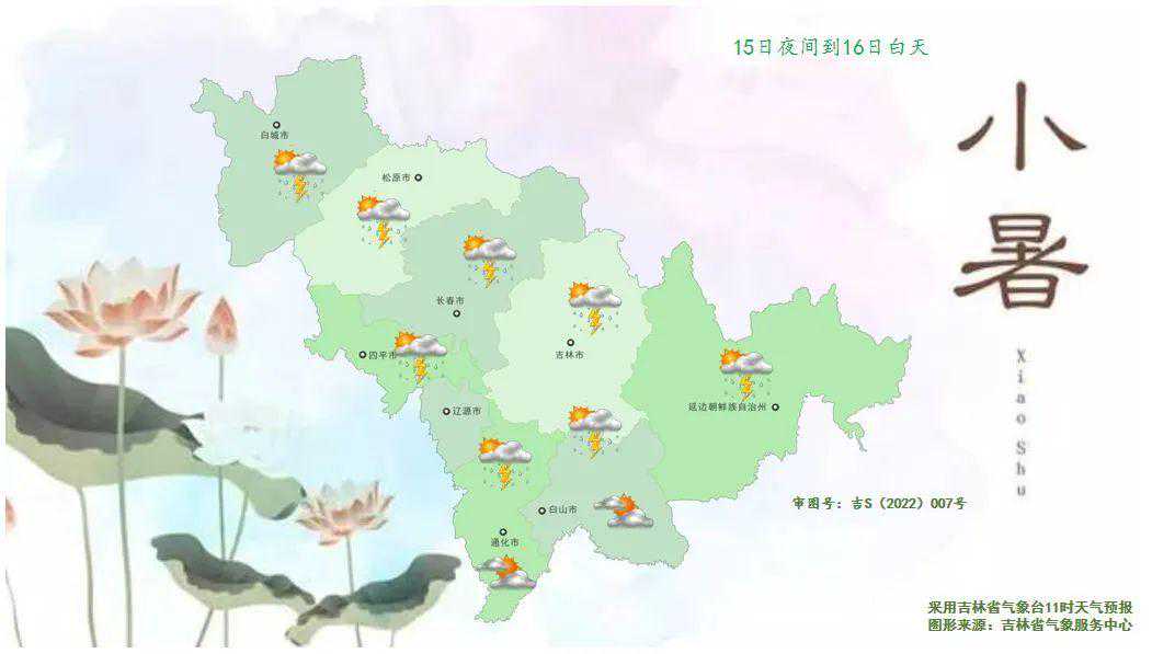 16日夜间到17日白天,全省多云,松原东部、长春、四平、辽源、吉林、通化、白山、延边、长白山保护区有阵雨或雷阵雨。